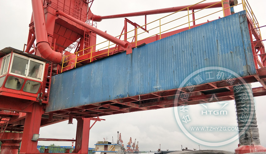 馬鞍山港碼頭,后場450t/h礦粉生產線,通過300米密封式皮帶機給到布置在駁船上的一臺500t/h礦粉弧形軌道裝船機。通過本次老舊設備改造,為業主徹底解決環保不達標停產問題。做到無揚塵、環保、節能、高效。